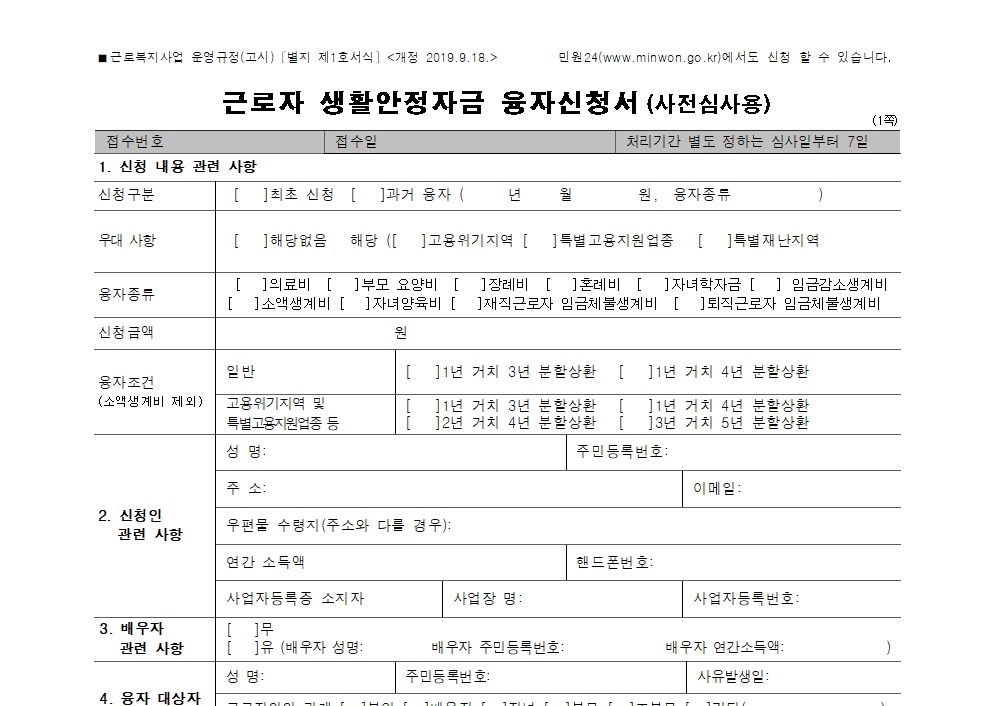 융자를 신청하실 때는 여러 항목이 있지만 통합신청서 1장만 작성하시면되는데요. 처음 작성하시는 분들이 대부분이라 작성에 어려움이 있으실 경우 근로복지공단으로 문의하시면 자세하게 안내받으실 수 있습니다.