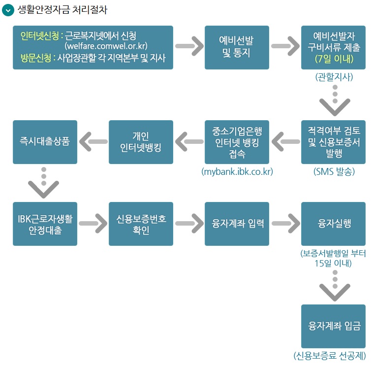 내가 필요한 대출항목과 조건들을 확인하셨다면 이제 근로자 생활안정자금 신청 및 지급절차에 대해서 알아봐야할텐데요. 아래 절차도와 같이 진행되니 확인하시면 되겠습니다.