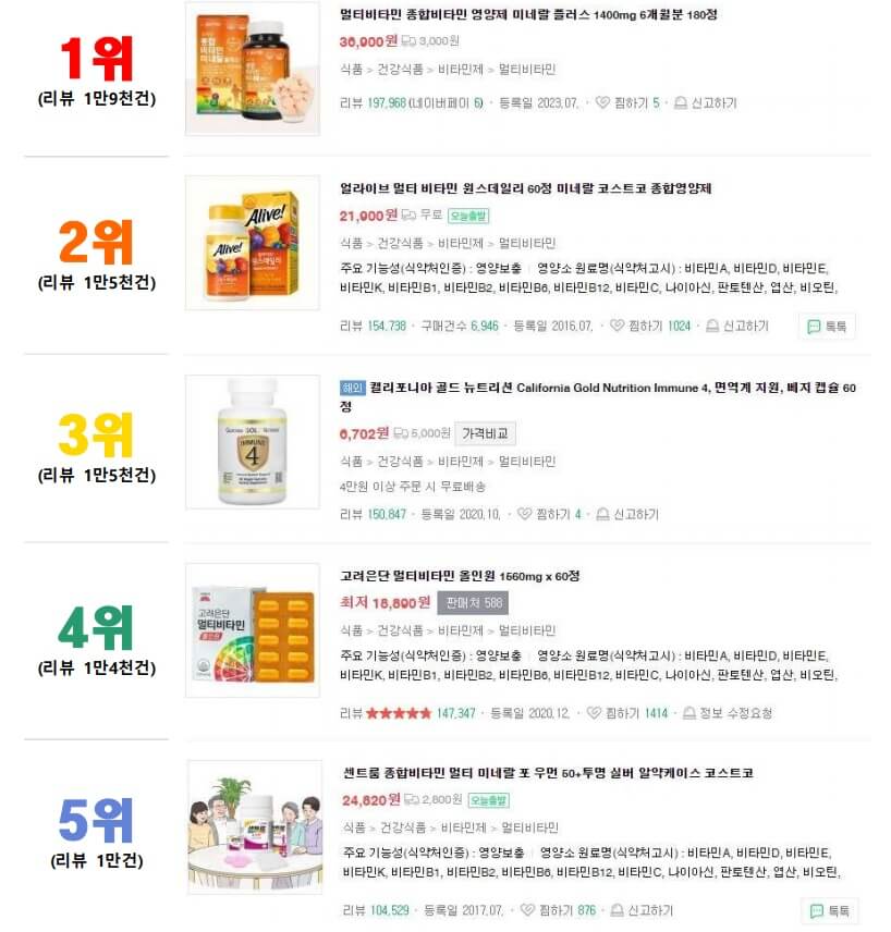 종합비타민 TOP 5는 네이버 쇼핑에서 구매후기(리뷰) 많은 순으로 정렬한 순위입니다. 물론 리뷰가 많다고 해서 무조건 좋은 제품은 아니지만 시중에서 가장 쉽고 안전하게 구입할 수 있는 제품으로 비교해서 실 구매시 도움이 되도록 살펴보도록 하겠습니다.